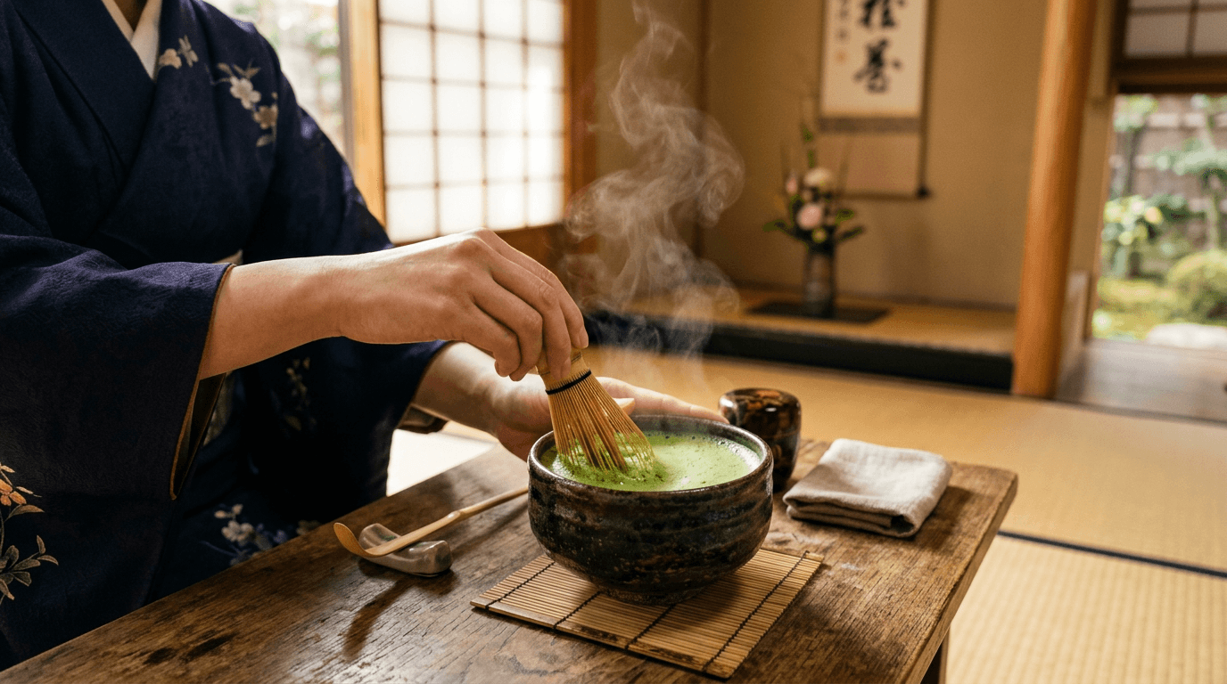 El matcha se prepara batiendo el polvo con agua. Sin infusión: consumes la hoja entera.